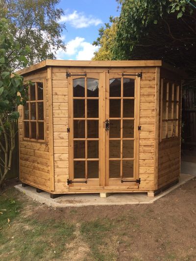 The Corner House is available in three sizes in a pent roof style only, it comes with joinery quality georgian swept arch double doors and fixed or opening windows on both side panels at no extra cost.