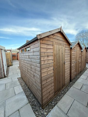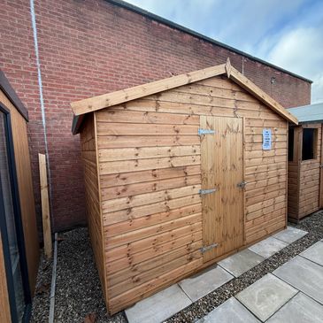 8' x 6' Secure Apex with framed ledge & braced door, mortice lock & key & security windows.